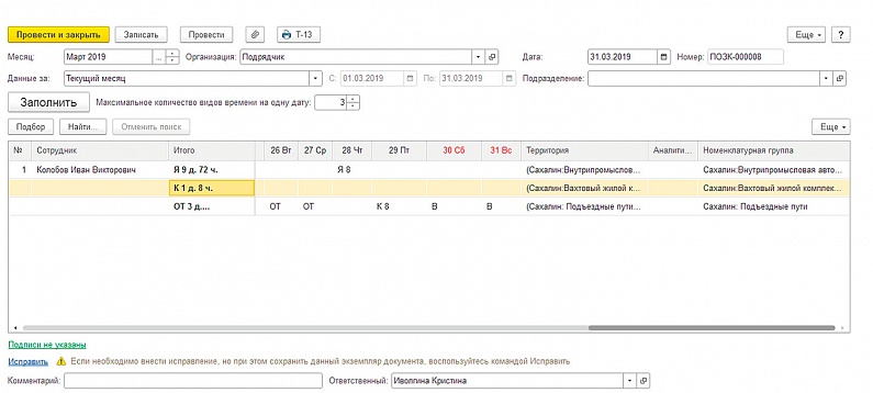 - Отражение в табеле учета рабочего времени количества часов, отработанных сотрудниками на различных объектах строительства.